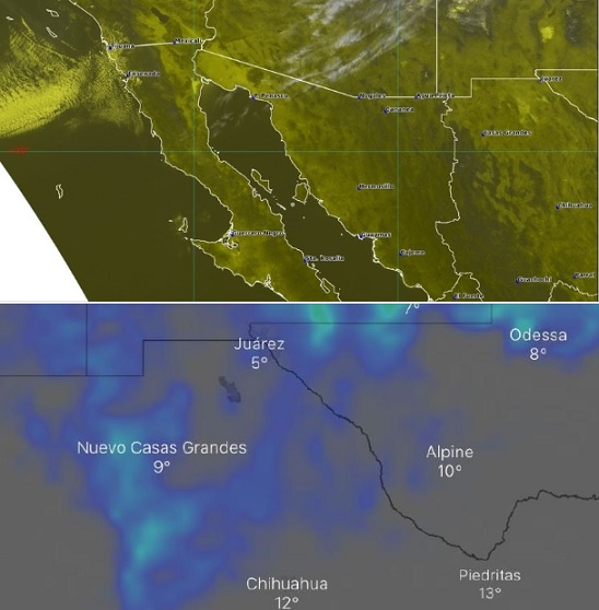 Durante el martes, el frente frío Núm. 27 se desplazará sobre el noreste de la República Mexicana, mientras que la corriente en chorro polar se extenderá sobre el noroeste, norte y noreste del país y la Cuarta Tormenta Invernal se ubicará sobre Texas, E.U.A., estas condiciones originarán ambiente frío a muy frío y vientos muy fuertes a intensos con tolvaneras sobre las regiones mencionadas; a su vez, se prevén lluvias y chubascos en el norte de Chihuahua, así como posible caída de nieve o aguanieve principalmente durante la mañana.
