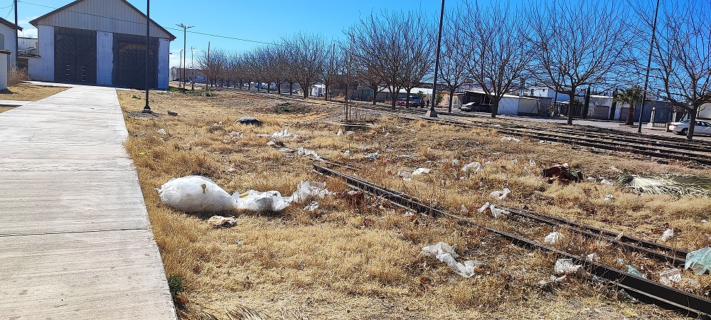 Mucha basura acumulada de varias semanas se puede apreciar, bolsas grandes de basura, hojas de palmeras, plásticos, cartón, botes en si mucha basura en este importante lugar de los talleres del ferrocarril que son historia de Nuevo Casas Grandes y que administraciones pasadas se han dado a la tarea de rescatar la historia y cultura del municipio rehabilitando estas áreas.