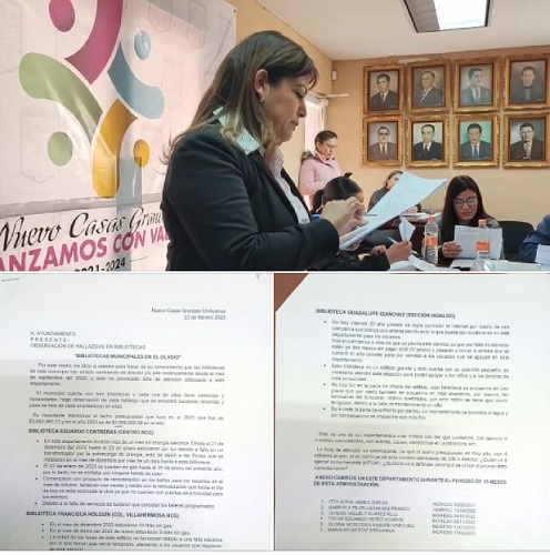 Bibliotecas del municipio de Nuevo Casas Grandes en deplorables condiciones, hasta por un mes sin luz, con baños en reparación por mas de cinco meses, con derrame de agua por falta de mantenimiento inundadas personal saca el agua con escobas, sin internet, sin gas y con aguas negras la puerta de su entrada, estos señalamientos dio a conocer la sindico Venus Yadira Olmos hoy al cabildo.