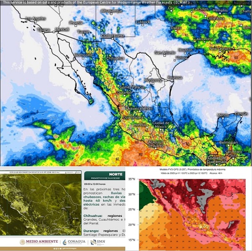 Habrá lluvias de intensidad ligera a dispersa en Juárez, Ahumada, Guadalupe, Carichí, Chihuahua, San Francisco de Borja, Satevó, Parral, Santa Bárbara, Jiménez, Camargo, Delicias, Aldama y Ojinaga, mismas que podrían ir acompañadas de actividad eléctrica y posible caída de granizo.