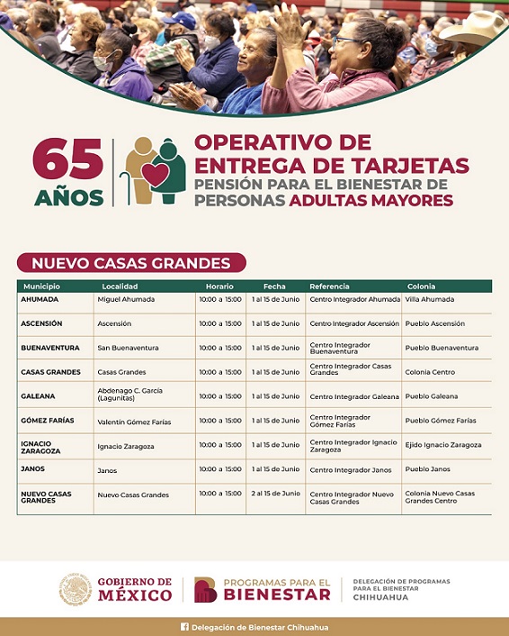 En las mismas fechas, en los municipios de Ahumada, Ascensión, Buenaventura, Casas Grandes, Galeana, Gómez Farías, Ignacio Zaragoza, Janos y Nuevo Casas Grandes se entregarán en total 432 tarjetas en los centros integradores de cada uno de estos municipios de 10 de la mañana a tres de la tarde.
