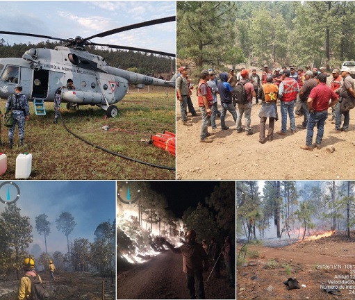 Como ayuda adicional, en las últimas horas arribó a ciudad Madera un equipo especial a bordo de un helicóptero MI 17, de la Sedena, que realiza descargas de agua y de retardante con la ayuda de un helibalde o “bambi bucket”, que tiene una capacidad de 2 mil 500 litros.