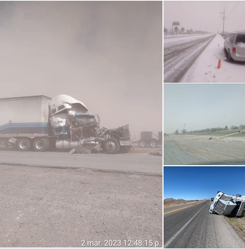 Asimismo, sobre la carretera Chihuahua-Delicias, en el kilómetro 172+000, se suscitó un accidente vehicular generado por la baja visibilidad, donde se vieron involucrados dos tráiler; además en el km 100 de la vía corta a Parral- Chihuahua, un tracto camión de carga pesada volcó, debido las fuertes ráfagas de viento.