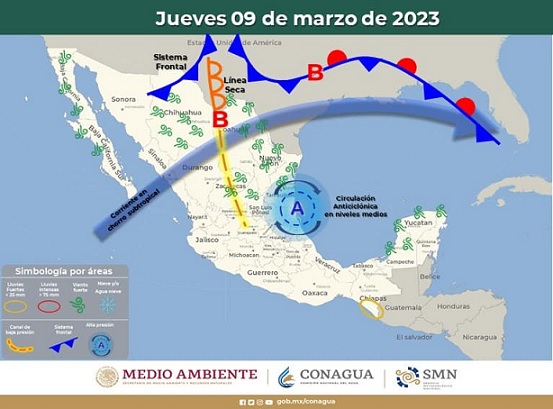 Respecto al jueves 9, el frente frío 38 se mantendrá sobre el noreste del país, acompañado de una corriente en chorro, una línea seca y un canal de baja presión, lo que favorecerá un cielo parcialmente nublado y con caída de precipitaciones aisladas en Riva Palacio, Santa Isabel, Aquiles Serdán, Aldama, Chihuahua, Delicias y Rosales.