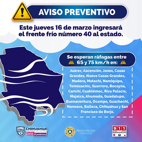 Por tal motivo la CEPC emitió una alerta y exhorta a la población a tomar medidas preventivas para evitar accidentes derivados de tolvaneras, caída de objetos, muros o árboles, entre otros, que pudieran presentarse debido a las fuertes ráfagas de viento que se pronostican para próximas las próximas 24 horas.