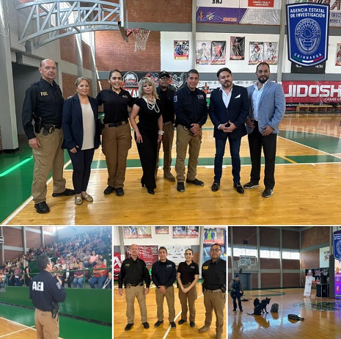 Elementos de la Agencia Estatal de Investigación a través del Grupo de Orientación Escolar Chihuahuense (GOECHI), de la Fiscalía General del Estado, presentaron los protocolos de seguridad escolar a padres de familia, alumnos y docentes del Centro de Estudios Tecnológicos, Industrial y de Servicios (Cetis) No. 93 del municipio de Nuevo Casas Grandes.