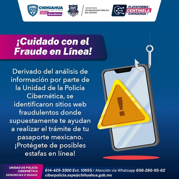 La Unidad de Policía Cibernética de la SSPE emite una advertencia sobre el aumento de sitios web fraudulentos que prometen ayudar en el trámite del pasaporte mexicano, generando un daño al patrimonio de las y los chihuahuenses.