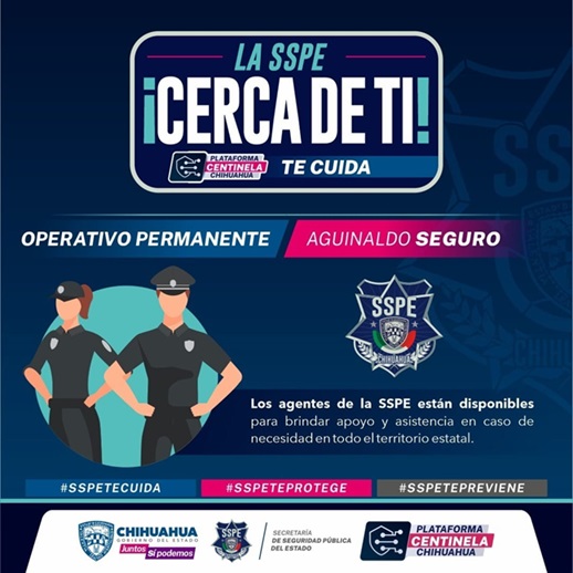 El operativo "Aguinaldo Seguro" representa un trabajo conjunto de la SSPE a través de herramientas de la Plataforma Centinela, para garantizar la seguridad de todos los chihuahuenses durante la temporada de aguinaldos.