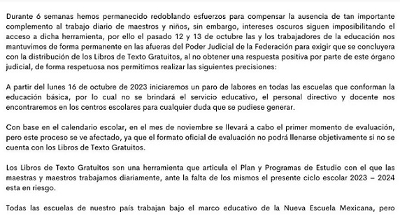Las Secciones 8 y 42 del Sindicato Nacional de Trabajadores de la Educación (SNTE) reiteraron que a partir de mañana 16 de octubre, las escuelas de educación básica públicas de la entidad no impartirán clases en tanto no se concluya con la distribución de los nuevos libros de texto gratuito.