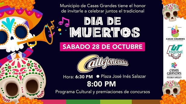 ESTE SABADO 28, CONCURSO DE CATRINAS, ALTARES, PROGRAMA CULTURAL Y CALLEJONEADA EN CASAS GRANDES |