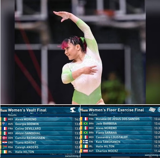 La gimnasta de 29 años, originaria de Mexicali, Baja California, se impuso con las mejores puntuaciones en la prueba: 14.075, con lo cual superó a la australiana Georgia Godwin, quien obtuvo 13.850; y a la francesa Coline Devillard, que consiguió 13.800.