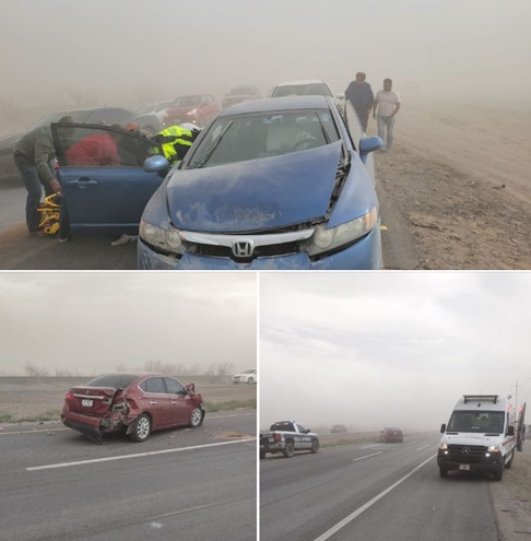 Estas condiciones generaron nula visibilidad en la zona, lo que ocasionó un percance que involucra a seis vehículos, el cual dejó una mujer lesionada, en hechos ocurridos a la altura del kilómetro 223 del tramo Ahumada-Ciudad Juárez.