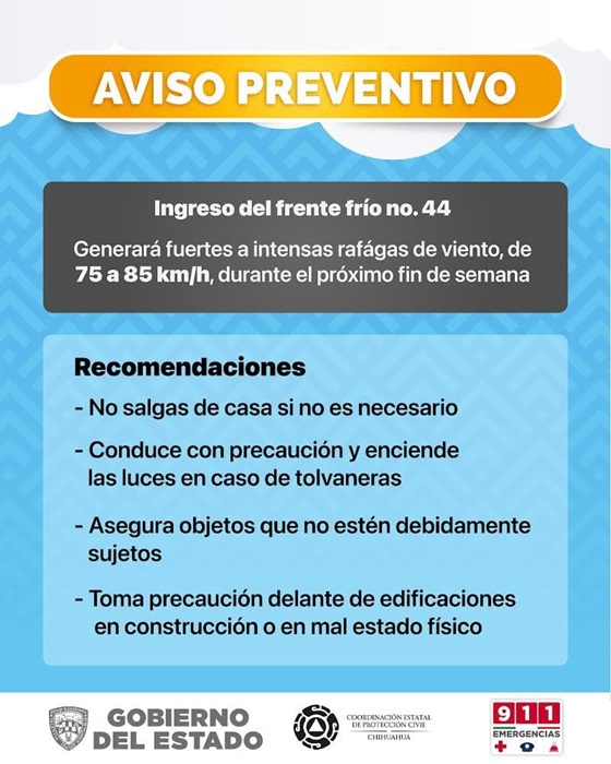 La Coordinación Estatal de Protección Civil (CEPC) informa que para este fin de semana, se prevé la presencia de fuertes vientos en gran parte de la entidad, generados por el ingreso al país del frente frío número 44.