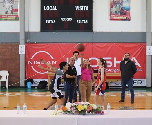 Una vez concluida la ceremonia formal, dos jóvenes promesas del básquetbol local, acompañados por la Presidente Municipal, realizaron el primer saque, marcando simbólicamente el inicio de la temporada de la Liga Estatal de Básquetbol. |