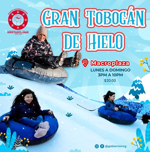 El espíritu navideño invade nuestra ciudad con la llegada del Gran Tobogán de Hielo, una atracción única que promete diversión y magia para toda la familia. Por primera vez, los habitantes de Nuevo Casas Grandes podrán vivir la experiencia de deslizarse por este espectacular tobogán, diseñado para llenar de alegría y emoción estas fiestas decembrinas.