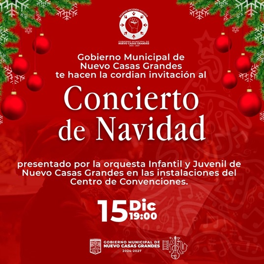 El Espíritu Navideño se hará presente en nuestra ciudad este próximo *domingo 15 de diciembre*, con el *Concierto de Navidad* ofrecido por la talentosa *Orquesta Infantil y Juvenil de Nuevo Casas Grandes*. Este evento especial tendrá lugar en las instalaciones del *Centro de Convenciones*, en punto de las *7:00 PM*.