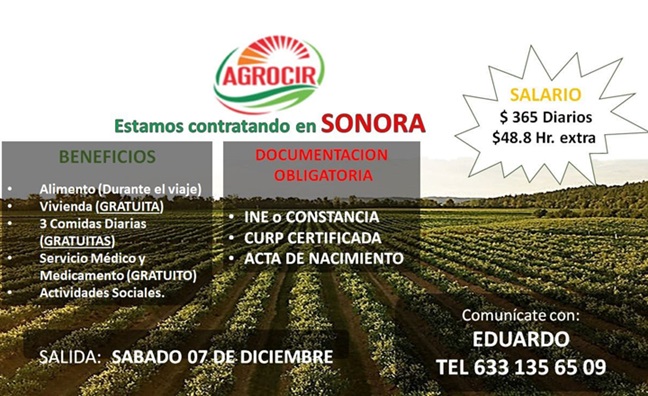 AGROCIR y Gobierno Municipal de Nuevo Casas Grandes te invitan a trabajar en los campos ubicados en la Costa de Hermosillo y Valle de Guaymas, Sonora.