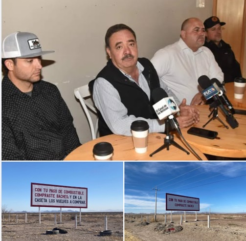 En los espectaculares se puede LEER “CON TU PAGO DE COMBUSTIBLE COMPRASTE BACHES, Y EN LA CASETA LOS VUELVES A COMPRAR”