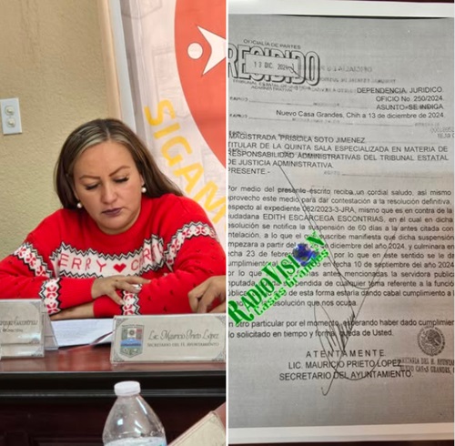Este jueves en asuntos generales de sesión ordinaria de cabildo la presidenta Edith Escárcega notifico a los regidores del H. Ayuntamiento que acata suspensión del Tribunal Estatal de Justicia Administrativa (TEJA), la suspensión de 60 días como presidenta municipal de Nuevo Casas Grandes y se retirara del puesto el 25 de diciembre del año en curso y regresar a funciones el 24 de febrero del 2025.