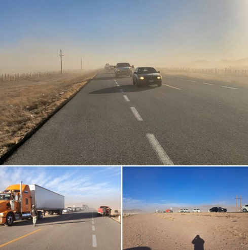 En Nuevo Casas Grandes se registró presencia de fuertes vientos, tolvaneras y baja visibilidad en carreteras; Ahumada reportó también fuertes vientos, tolvaneras y visibilidad de un 60 por ciento.