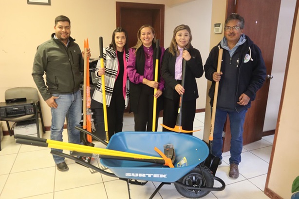 El material donado consta de: 2 palas, 2 picos, 2 rastrillos, 2 pistolas para riego metálicas, 2 azadones, 1 carretilla y 2 barras de punta.