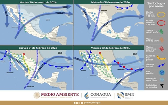 Durante el jueves 01 de febrero, el frente frío No. 32 ingresará sobre el noroeste de México, en interacción con una vaguada polar y una corriente en chorro subtropical, dando origen a la Quinta Tormenta Invernal.