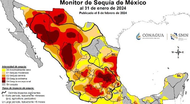 De acuerdo a la misma Conagua, la llamada Sequía Extrema (D3), representa las perdidas mayores en cultivos y pastos, el riesgo de incendios forestales es extremo, se generalizan las restricciones en el uso del agua debido a su escasez, lo cual está cubriendo actualmente el 49% del territorio estatal.
