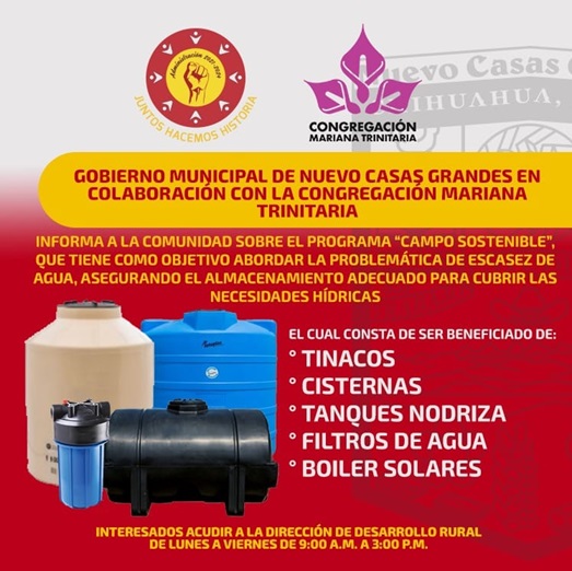 El Gobierno Municipal de Nuevo Casas Grandes se complace en anunciar el lanzamiento oficial de la convocatoria para el programa “Campo Sostenible”, en colaboración con la Congregación Mariana Trinitaria. Esta iniciativa tiene como objetivo abordar la problemática del abastecimiento de agua en nuestras comunidades rurales.