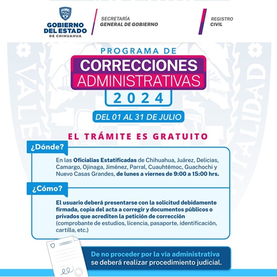 La Dirección General del Registro Civil invita a las y los chihuahuenses, a aprovechar durante el mes de julio el “Programa de Correcciones Administrativas 2024”, para la rectificación sin costo de datos en actas de todo tipo.