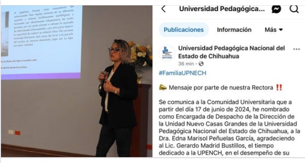 La doctora Edna Marisol Peñuelas García fue nombrada como encargada de despacho en el campus Nuevo Casas Grandes de la Universidad Pedagógica Nacional del Estado de Chihuahua, luego de las constantes denuncias de acoso y discriminación contra Gerardo Madrid Bustillos.