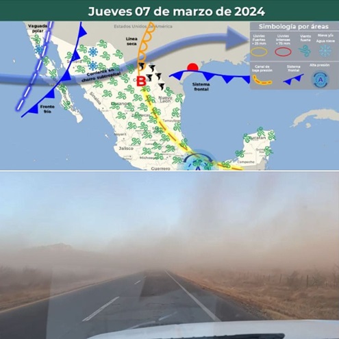 La Coordinación Estatal de Protección Civil (CEPC) emitió una alerta preventiva debido a la presencia de un nuevo sistema frontal que propiciará la formación de tolvaneras en tramos carreteros durante la tarde del jueves 7 de marzo.