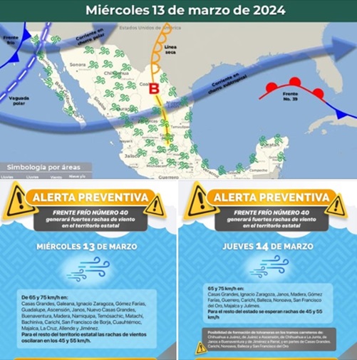 El miércoles 13 de marzo se mantienen las condiciones de fuertes vientos en el estado, con ráfagas que pueden superar los 65 y 75 en Casas Grandes, Galeana, Ignacio Zaragoza, Gómez Farías, Guadalupe, Ascensión, Janos, Nuevo Casas Grandes, Buenaventura, Madera, Namiquipa, Temósachic, Matachí, Bachíniva, Carichí, San Francisco de Borja, Cuauhtémoc, Majalca, La Cruz, Allende y Jiménez.