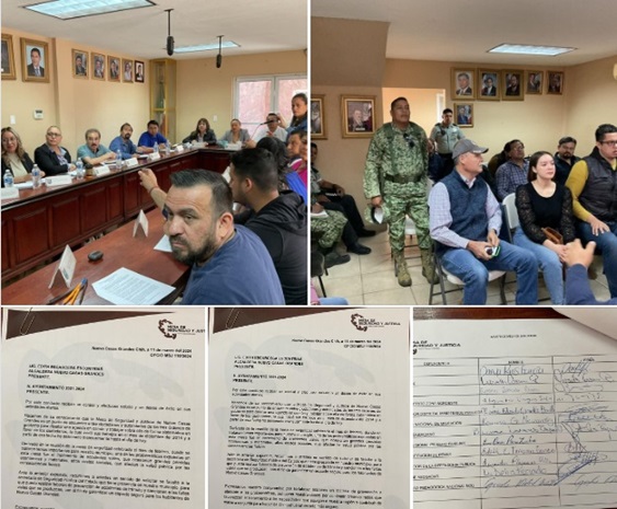 Integrantes de Mesa de Seguridad atendieron invitación de FICOSEC a asistir a sesión ordinaria de cabildo, donde entregaron al H. Ayuntamiento un oficio firmado por cámaras de comercia de la localidad, así como por autoridades que conforman la Mesa de Seguridad, solicitando al H. Ayuntamiento de Nuevo Casas Grandes faculte a la Secretaria de Seguridad Publica del Estado para que pueda realizar labores de prevención de accidentes de transito y sanciones a las faltas viales que se produzcan, con el fin de garantizar un espacio seguro para los habitantes de Nuevo Casas Grandes, esto ante el incremento de accidentes viales que ha estado ocurriendo la ultimas semanas y algunos de ellos con pérdidas humanas.