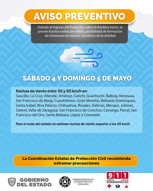 Los vientos tendrán una velocidad promedio de 10 a 20 km/h, con ráfagas que podrían superar los 55 y 65 km/h en algunas áreas específicas, especialmente en Saucillo, La Cruz, Allende, Jiménez, Carichí, Guachochi, Balleza, Nonoava, San Francisco de Borja, Cuauhtémoc, Gran Morelos, Belisario Domínguez, Santa Isabel, Riva Palacio, Chihuahua, Rosales, Delicias, Meoqui, Julimes, Satevó, Valle de Zaragoza, San Francisco de Conchos, Camargo, Parral, San Francisco del Oro, Santa Bárbara, López y Coronado.