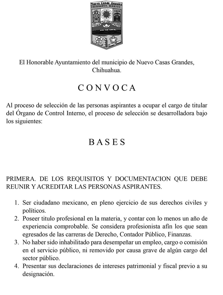 El H. Ayuntamiento de Nuevo Casas Grandes convoca al proceso de selección de las personas aspirantes a ocupar el cargo de titular del Órgano de Control Interno.