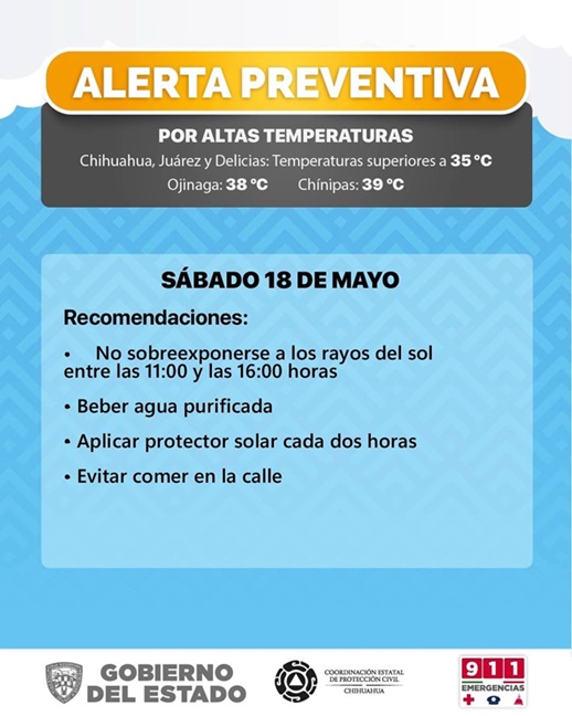 Las máximas esperadas para son: Chihuahua 38/18, Juárez 36/21, Janos 33/14, Madera 28/9, Temósachic 30/8, Cuauhtémoc 32/13, Ojinaga 41/21, Delicias 39/18, Camargo 38/18, Jiménez 37/17, Parral 35/16, Creel 28/6, Chínipas 40/20, Guachochi 28/6 y El Vergel 27/5.