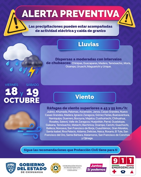 Las lluvias persistirán durante el viernes y sábado, especialmente en los municipios de Chínipas, Guazapares, Madera, Temósachic, Moris, Ocampo, Uruachi, Maguarichi y Urique.