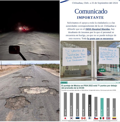 Los tramos carreteros permanecen en el olvido por parte del gobiernos federal, no han tomado en cuenta a los millones de personas que los hicieron ganar votando por MORENA. En cuanto a salud los IMSS de la republica la mayoría esta sin medicamentos, sin insumos, sin médicos, La educación de México en los últimos lugares según datos internaciones. La seguridad del País pues.