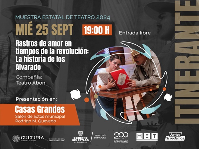 En Casas Grandes la Compañía de teatro “Aboni”, originaria de Parral, presentará la obra “Rastros de amor en tiempos de la revolución: la historia de los Alvarado”, en el Salón de Actos Municipal “Rodrigo M. Quevedo”, el miércoles 25 de septiembre a las 19:00 horas.