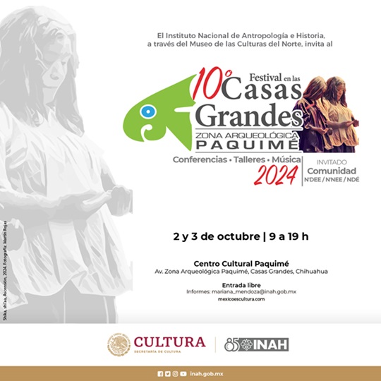 En este marco el Centro INAH Chihuahua a través del Museo de las Culturas del Norte, presenta la décima edición del Festival en las Casas Grandes, el miércoles 2 y jueves 3 de octubre próximos. Su programa comprende de conferencias, talleres, exposiciones y la entrega de un reconocimiento. En esta edición, el Festival en las Casas Grandes tiene como invitada especial a la comunidad N'dee/Nnee/Ndé, quien a través de varias actividades nos dará a conocer parte de su historia, cultura, tradiciones y los aspectos etnográficos más importantes.