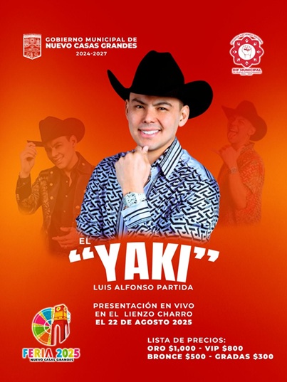 – El Gobierno Municipal de Nuevo Casas Grandes anuncia que el próximo 22 de agosto se presentará en concierto el reconocido cantante Luis Alfonso Partida “El Yaki”, interpretando sus grandes éxitos como solista, en el marco de las celebraciones de la Feria NCG 2025.