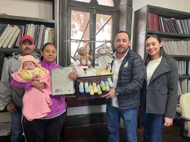 El Alcalde Roberto Lucero Galaz y la Directora del Registro, Lic. Taizeth Enríquez Jáquez, personalmente realizaron la entrega del obsequio a los padres felicitándolos por la llegada de la niña Jazmín.