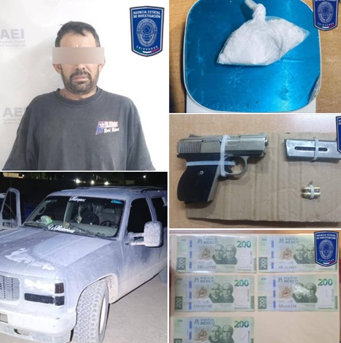 Elementos de la Agencia Estatal de Investigación, de la Coordinación Regional de la AEI Zona Noroeste, detuvieron en calles de Nuevo Casas Grandes a un masculino en posesión de un envoltorio con droga y un arma de fuego.