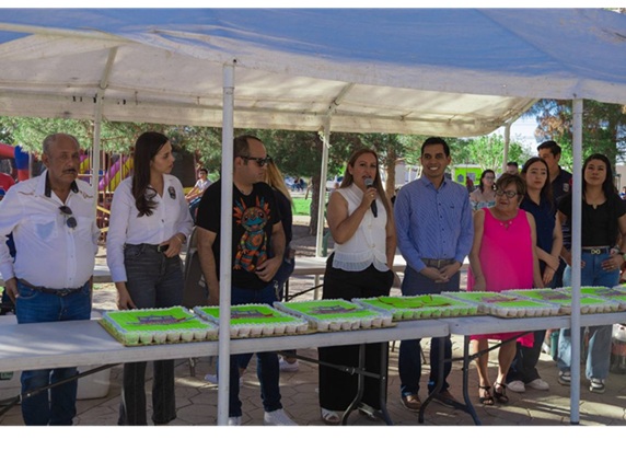 Con un delicioso pastel la presidenta municipal de Nuevo Casas Grandes, Lic. Edith Escárcega Escontrías, celebró con los asistentes a la plaza Héroes de la Democracia el 53 aniversario de la fundación de la colonia Villahermosa.