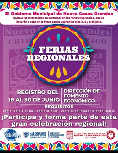 El Gobierno Municipal de Nuevo Casas Grandes a través del Departamento de Fomento Económico abrió la convocatoria para todos los interesados en participar en la Feria Regional que se llevará a cabo los días 4, 5 y 6 de julio en la plaza Benito Juárez, informó la titular de esta dirección, Lic. Sayuriko Nevárez Mar.