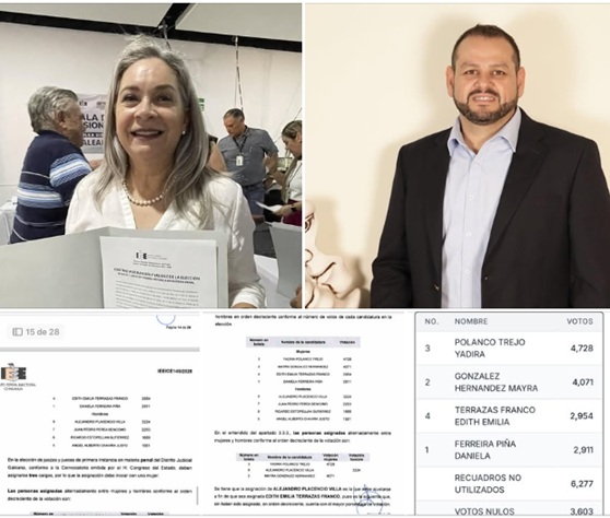 Donde originalmente eran dos mujeres y un hombre para el cargo de juez, en la elección recién pasada quedaron electos según datos oficiales del IEE, Yadira Polanco , Trejo con 4728 votos, Mayra González Hernández 4071 votos y Alejandro Placencio Villa con 3224 votos
