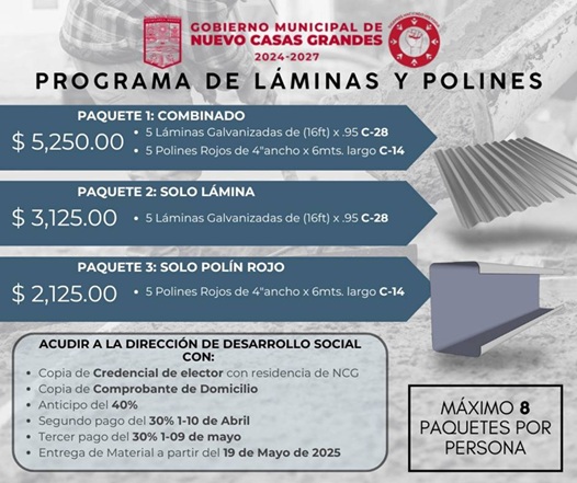 El Gobierno Municipal de Nuevo Casas Grandes a través de la Dirección de Desarrollo Social, se complace en anunciar el lanzamiento del programa destinado al mejoramiento de vivienda, ofreciendo material subsidiado. Este programa tiene como objetivo apoyar a las familias en la mejora de sus hogares, facilitando el acceso a materiales de construcción a precios accesibles.