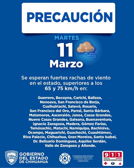 La Coordinación Estatal de Protección Civil Chihuahua emite una alerta preventiva para este Martes, 11 de marzo, próximo jueves 13 y viernes 14, se prevén fuertes vientos fuertes