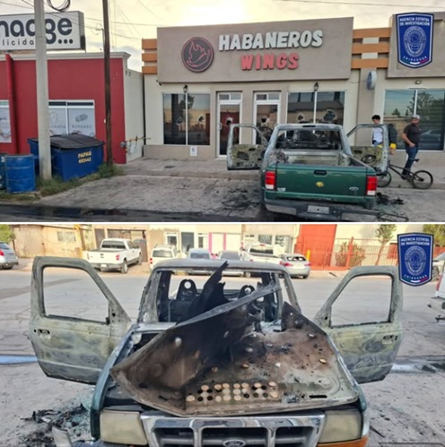 Se constató que resultó incendiada una pick up Ford Ranger color verde modelo 2001, sin placas de circulación, así como un establecimiento de nombre "Habaneros Wings", el cual presentaba vidrios quebrados, así como una leyenda sobre la banqueta, dirigido a ese mismo lugar, con lo que se descarta algún delito de otra índole como intento de extorsión, además de que se cuenta con un video en el que observa el momento de la agresión.
