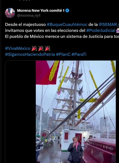 ANTES DEL CHOQUE BUQUE CUAUHTÉMOC MORENISTAS EN EU USAN EL BUQUE PARA PROMOVER ELECCIÓN JUDICIAL; LLAMAN A VOTAR POR LENIA BATRES Y OTROS |
